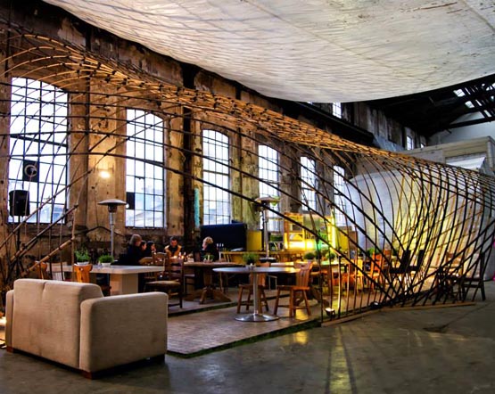 900 metros de caña de bambú, 600 metros de cuerda negra y 300 metros de neumáticos de bicicleta recuperados de talleres locales son las claves del original diseño de Favelous 963, un exitoso restaurante pop-up en Amsterdam (Holanda) ubicado en Fabrique Mediamatic, un edificio industrial vacío que anteriormente era utilizado para la fabricación de vagones de tren.