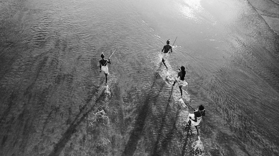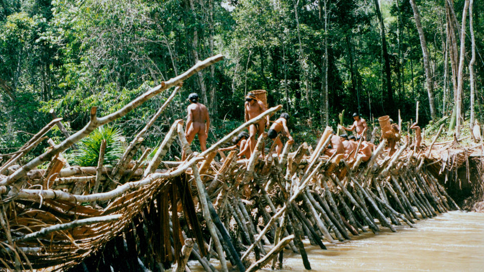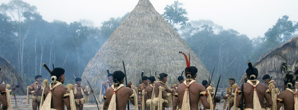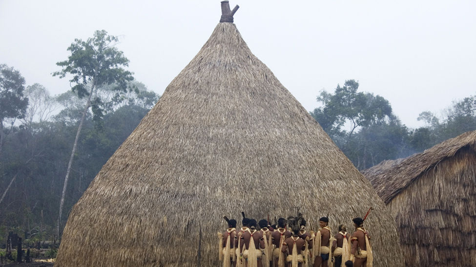 Los enawene nawes son expertos pescadores. Con las primeras luces del alba, hombres enawene nawes del estado de Mato Grosso, en Brasil, se reúnen frente al haiti, la casa de las flautas sagradas. Acaban de regresar de sus campamentos en la selva para celebrar la más importante ceremonia de pesca del año: el banquete Yãkwa./Fotografía: © Fiona Watson/Survival International