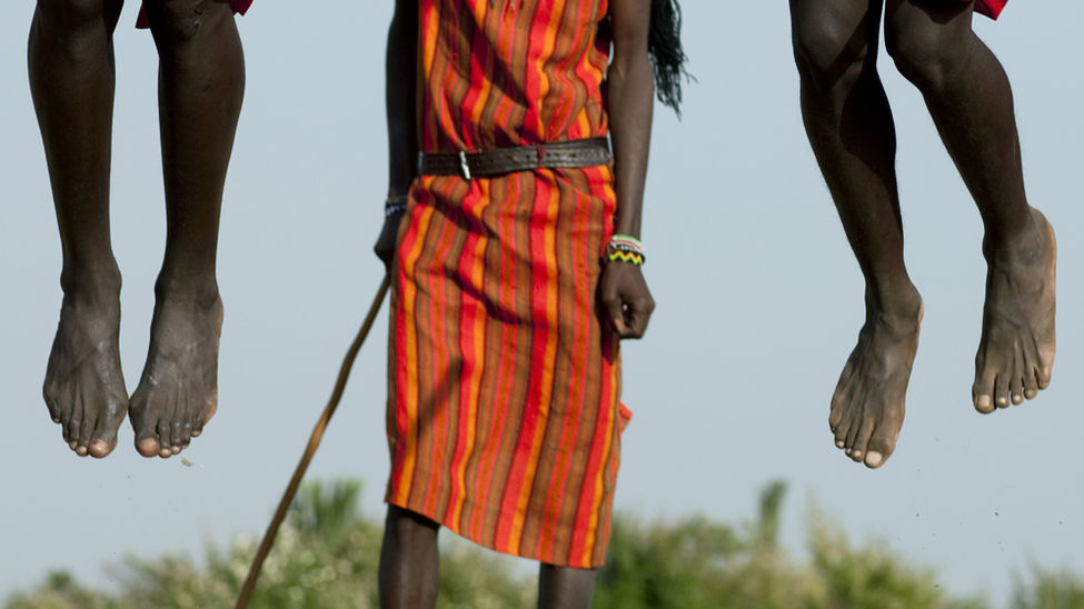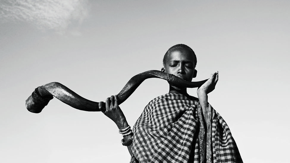 Los festivales tribales también rinden homenaje a los diferentes ciclos de la vida humana. En el este de África, un joven masái toca el cuerno de un gran antílope kudu para reunir a los moranes para la ceremonia del e unoto, que anuncia la transición de adolescente moran a adulto. La ceremonia consiste en varios días de cantos y danzas./ Fotografía: ©Caroline Halley des Fontaine.