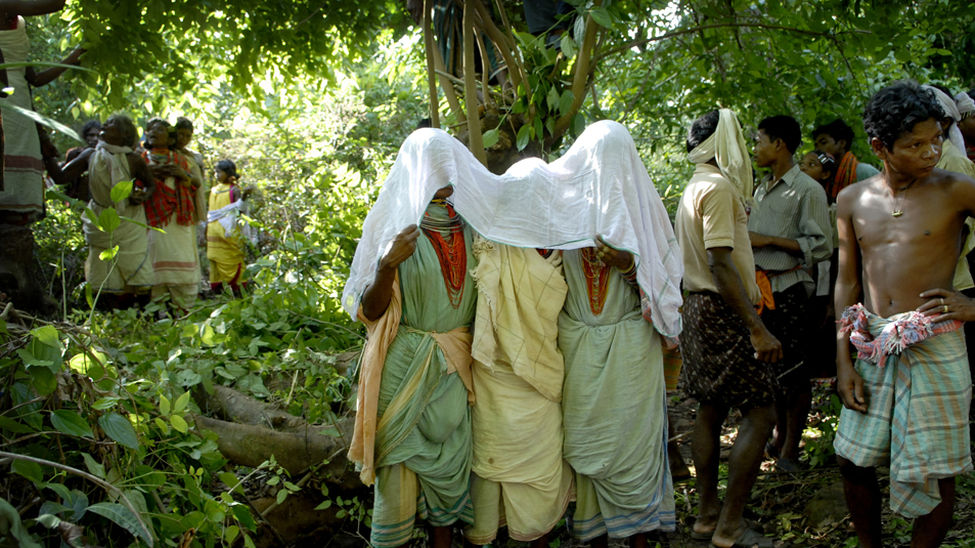 Durante los festivales de la cosecha, los dongria kondhs sacrifican búfalos para su dios y un hombre sagrado corre por carbones ardiendo. Niyam Raja es nuestro dios y le rendimos culto, explica un hombre dongria. Veneramos las rocas, las colinas, nuestros hogares y nuestras comunidades. Su modo de vida está amenazado por la empresa minera Vedanta Resources, que está decidida a extraer bauxita de las colinas de Niyamgiri. La mina a cielo abierto dinamitaría la cumbre de Niyam Dongar, destruiría los bosques de Niyamgiri, perturbaría el curso de los ríos y acabaría con los dongria kondhs como pueblo floreciente y diferenciado./ Fotografía: ©Jason Taylor / Survival International.