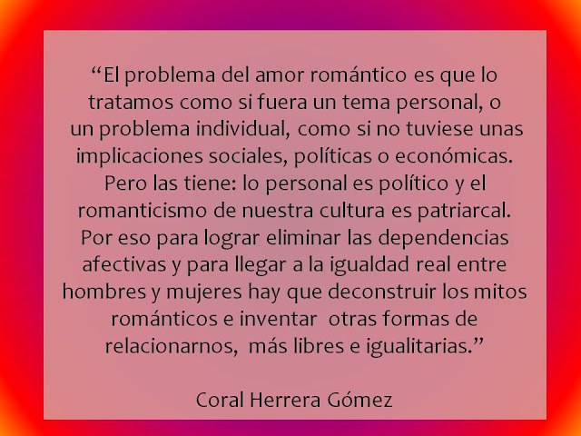 Lo personal es político, el romanticismo es patriarcal: asumimos modelos sentimentales, roles y estereotipos de género, y patrones de conducta patriarcales a través de la cultura. Y estos patrones los tenemos muy dentro, incorporados a nuestros sistema emocional. De este modo, también la gente de izquierdas y los feminismos seguimos anclados en viejos patrones de los que nos es muy difícil desprendernos. Elaboramos muchos discursos en torno a la libertad, la generosidad, la igualdad, los derechos, la autonomía… pero en la cama, en la casa, y en nuestra vida cotidiana no resulta tan fácil repartir igualitariamente las tareas domésticas, gestionar los celos, asumir separaciones, gestionar los miedos, comunicarse con sinceridad, expresar los sentimientos sin dejarse arrastrar por el dolor…