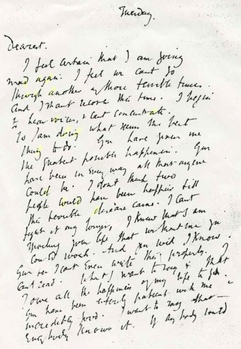 Estoy segura de que me vuelvo loca de nuevo. Creo que no puedo pasar por otra de esas espantosas temporadas. Esta vez no voy a recuperarme. Empiezo a oír voces y no puedo concentrarme. Así que estoy haciendo lo que me parece mejor. Me has dado la mayor felicidad posible. Has sido en todos los aspectos todo lo que se puede ser. No creo que dos personas puedan haber sido más felices hasta que esta terrible enfermedad apareció. No puedo luchar más. Sé que estoy destrozando tu vida, que sin mí podrías trabajar. Y sé que lo harás. Verás que ni siquiera puedo escribir esto adecuadamente. No puedo leer. Lo que quiero decir es que te debo toda la felicidad de mi vida. Has sido totalmente paciente conmigo e increíblemente bueno. Quiero decirte que… Todo el mundo lo sabe. Si alguien pudiera haberme salvado, habrías sido tú. No me queda nada excepto la certeza de tu bondad. No puedo seguir destrozando tu vida por más tiempo.