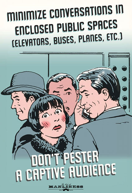 Pero sobre todo, los de Art of Manliness, un colectivo de personas que se dedican a analizar la masculinidad y la caballerosidad en el pasado y para el presente, presentaron unas láminas donde se exponían propuestas de buenos modales con los smartphone . Uno te indica que no es de buen gusto y educación tener largas conversaciones a grito pelado en espacios públicos, u otro te dice que no chequees tu móvil mientras estés hablando con otra persona.