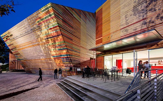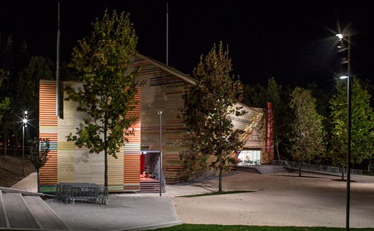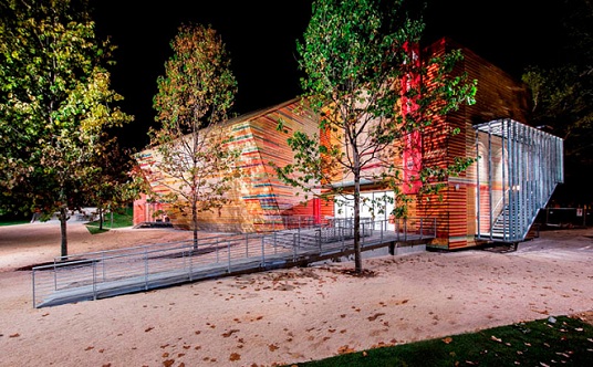Los listones sobrepuestos de las caras exteriores se pintaron con 24 colores diferentes, en tonos de verde, azul, rojos y amarillo, para instituir una secuencia de planos multicolores que minimiza el impacto de la edificación en el entorno natural.