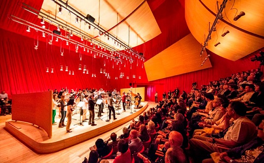 Los volúmenes contiguos a cada lado del auditorio contienen las actividades complementarias a la sala, uno alberga el foyer de la sala y el otro el equipamiento de servicio, unidos con el volumen principal a través de una circulación transversal de cubierta metálica y cerramientos transparentes.