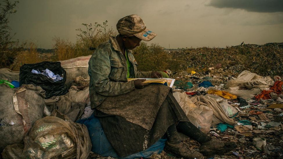 Una mujer sentada en unas bolsas de basura. Para ella, leer -aunque sea un catálogo de maquinaria- es un respiro en su tarea de buscar en la basura. Este es el vertedero más grande de África. Las personas que viven en sus alrededores presentan elevados niveles de plomo en sangre, por lo que son frecuentes los casos de problemas renales y cáncer, así como los problemas respiratorios debido a las altas concentraciones de gases de descomposición. Abierto en 1975, las autoridades medioambientales internacionales ordenaron su cierre hace 15 años, pero sigue en uso, a pesar de que en 2001 llegó al máximo de su capacidad/ Título: Mujer leyendo en el vertedero municipal de Dandora, Nairobi, Kenya/ Fotografía: Micah Albert