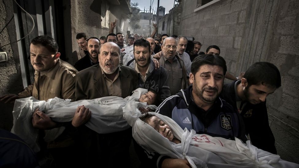 Suhaib Hijazi y su hermano mayor Muhammad fueron asesinados cuando su casa fue destruida por un misil israelí. Sus tíos llevan sus cuerpos a la mezquita donde se celebrará el funeral. La fotografía del año, según el World Press Photo/Fotografía: Paul Hansen