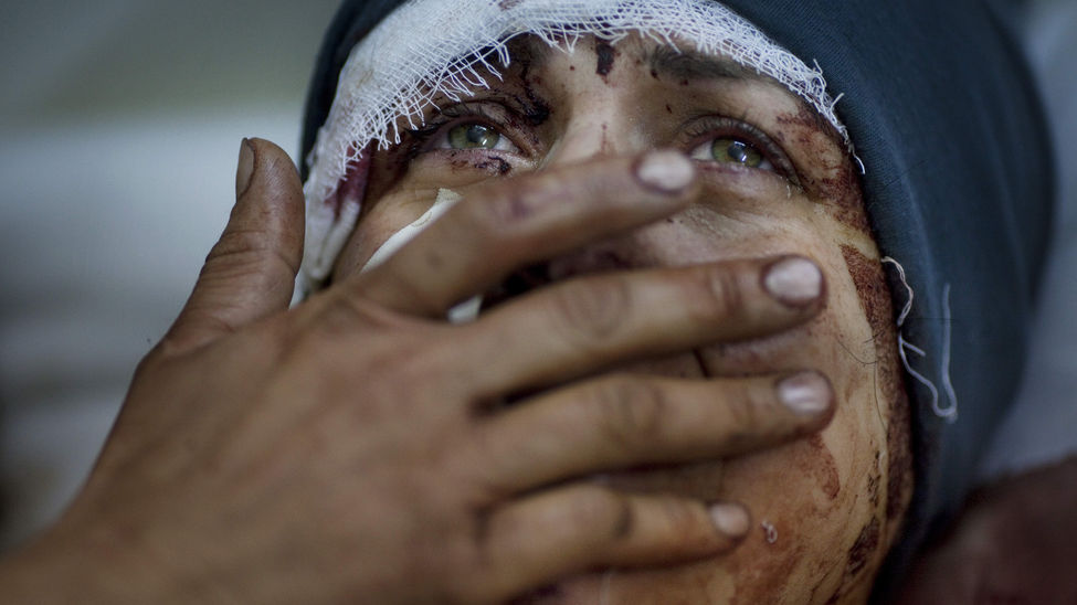 Aida llora mientras se recupera de las heridas provocadas por el bombardeo a su casa, por parte del ejército sirio. Su marido y sus dos hijos fueron gravemente heridos/Primer premio en la categoría de noticias generales en el World Photo Press/ Fotografía: Rodrigo Abd