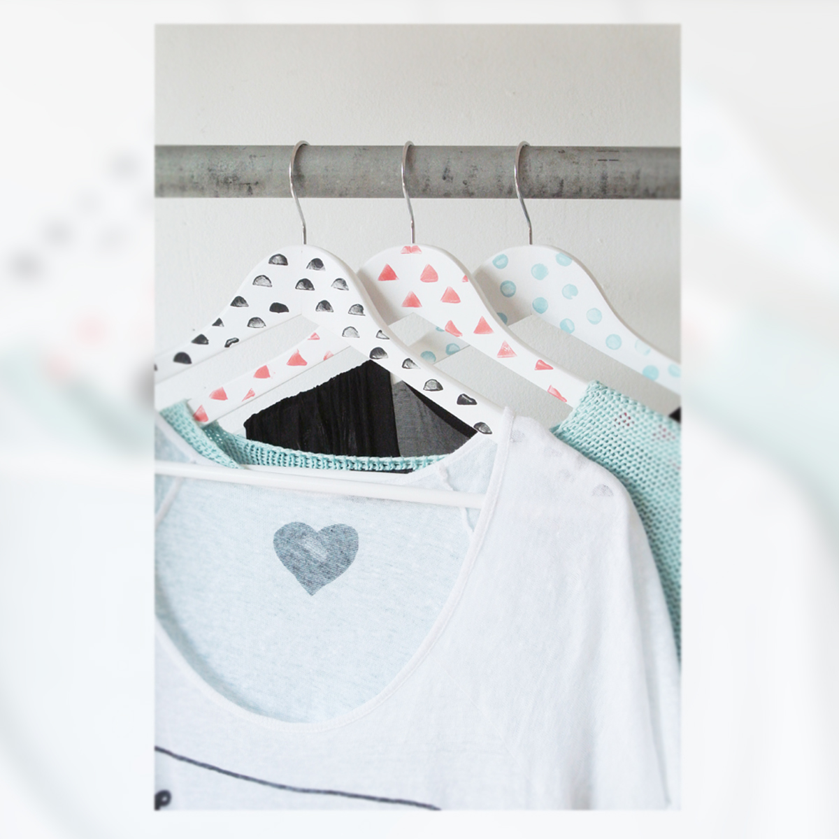 Tan solo necesitamos perchas blancas, pintura de los colores que más os gusten y una goma de borrar que sirva para hacer de modelo. Con un cuchillo dibujamos y rebajamos la goma para obtener nuestro sello personalizado y así conseguir diferentes patrones y estampados.