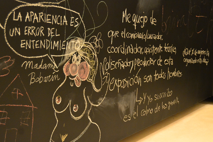 Al finalizar la exposición, cuando uno o una está completamente imbuido o imbuida por el deseo de igualdad, le entregan a uno o a una unas tizas de colores y de coloras para que se exprese aunque no por ello ha de ser feminista, que suena muy mal. Yo, que había recorrido la exposición en cueros convertida en mi propia obra de arte -con una sonrisa a lo Moma Lisa- realicé un bonito garabato lleno de feminismo e ilusión.