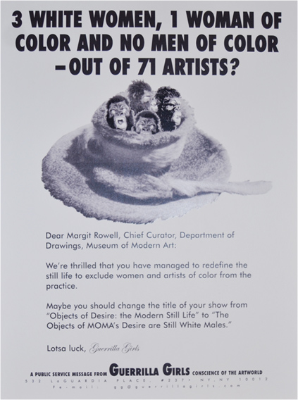 En 1985 el MOMA de Nueva York celebró una exposición de arte contemporáneo titulada An Internacional Survey of Painting and Sculpture. De los 169 artistas que participaron en ella, sólo 13 eran mujeres. Frente al museo se manifestaba un grupo de mujeres contra esta desigualdad –muy Momas y monas- vistiendo máscaras de simios inspiradas en el personaje de King Kong que utilizaban como símbolo de dominio masculino, se hacían llamar Guerrilla Girls. El colectivo compartía un sentimiento de frustración al comprobar que a finales del siglo XX las diferencias entre sexos y razas persistían; las mujeres artistas continuaban sin tener un verdadero reconocimiento.