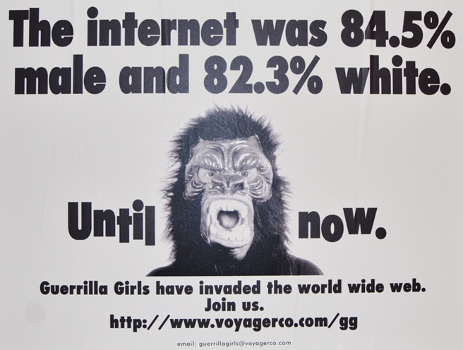 En la intersección entre el arte y el activismo, Guerrilla Girls son una voz destacada de la última etapa del movimiento de arte feminista. Un movimiento que se ha ocupado de desbaratar ficciones que, como las de ’artista genio’ y ’obra maestra’, sostienen un concepto de arte independiente de su contexto social e histórico, forjado en el siglo XIX pero vigente en la actualidad. Ficciones que sirven para perpetuar los procesos de mistificación de un arte que se clasifica como mayor o menor dependiendo del sexo y de la raza de quien lo produzca. La cosa no consiste en firmar como Paco cuando una es Paca.