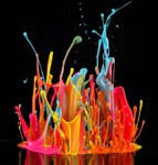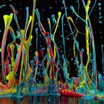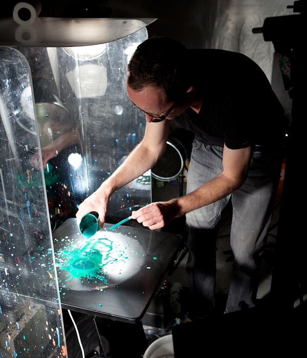 Después de encender el altavoz al volumen máximo, “dejo la creación de la imagen al sonido en sí mismo”, dice. De tal modo, en el preciso momento en que la pintura comienza a volar, un disparador sonoro (un dispositivo que detecta los picos de ruido) automáticamente toma fotos con una cámara Hasselblad.