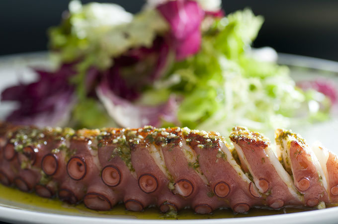 Un nuevo gallego que puede parecer veraniego y frio porque dominan los azules marineros combinados con el blanco de las mesas. Sin embargo, las fotos grandes de pulpos en el proceso de cocción, el falso tragaluz al cielo, el suelo de madera y los bodegones que separan la barra de raciones del restaurante aportan al ambiente un aire casero y limpio que resulta muy cómodo.