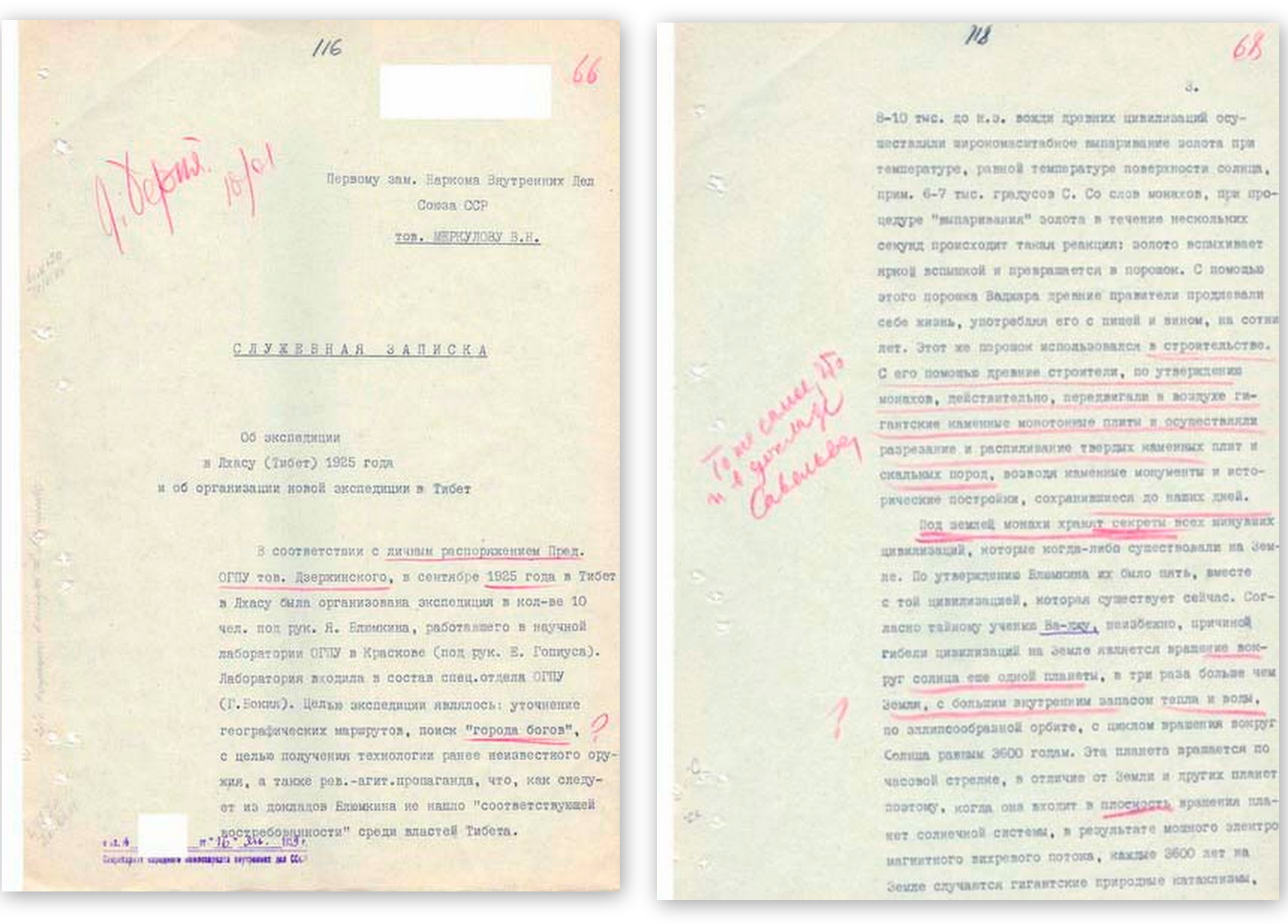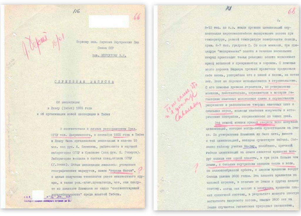 El memorándum resume una expedición al Tíbet; diez personas bajo la dirección de Yakov Blumkin fue enviada en 1925 al Tíbet en busca de artefactos de civilizaciones anteriores a la nuestra y la búsqueda de la Ciudad de los Dioses. En la actualidad, se ha escrito mucho sobre esta enigmática expedición, y ya no es un secreto que la expedición fue organizada por Félix Dzerzhinski (jefe del GPU) y dirigida por Boki Gleb, comunista encargado de investigar fenómenos paranormales. Según el documento, el principal objetivo de la expedición era demostrar la existencia de la Ciudad de los Dioses y conseguir las coordenadas geográficas de su ubicación, además de obtener la tecnología existente conocida por el tremendo poder destructivo. Como dato curioso, Hitler también envió expediciones secretas con el mismo objetivo que el Imperio Ruso.