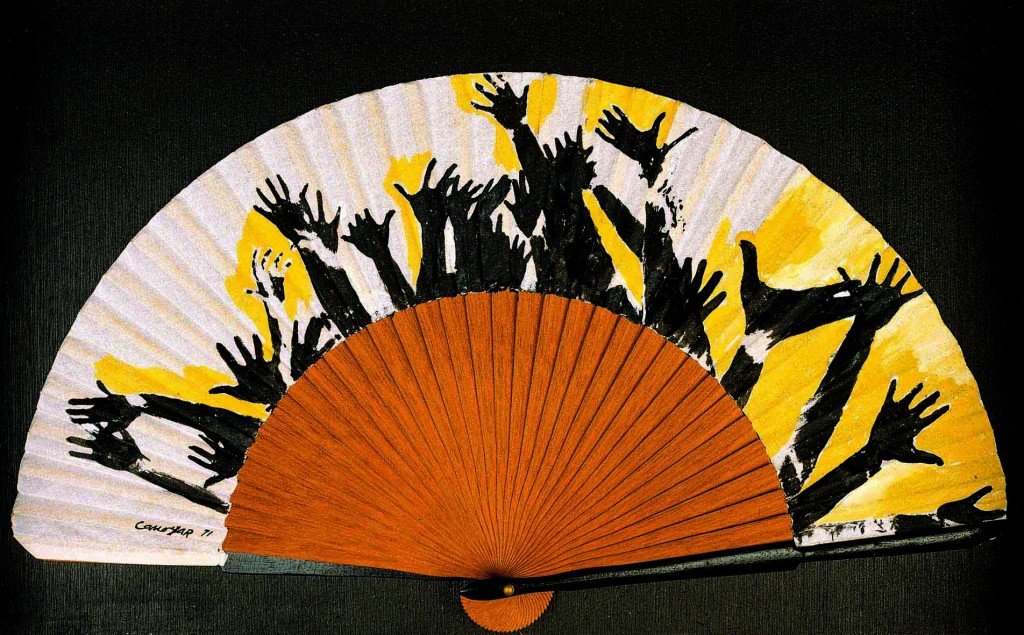 Tal es el caso de Joan Miró, que desarrolla con enorme soltura grafismos coloristas de gran simplicidad que entroncan con sus Constelaciones; de Antoni Tàpies, quien aplica la pintura directamente recurriendo a planteamientos informalistas y utiliza la cruz propia de su imaginario artístico; de Eusebio Sempere, que aplica una alternancia cromática en cada uno de los pliegues para remitir a la abstracción geométrica de efecto óptico que caracteriza su producción; de Manuel Millares, que entiende el abanico como otro soporte en el que desarrollar la suerte de escritura antigua, misteriosa e indescifrable, en la que trabaja a partir de los primeros años setenta.
