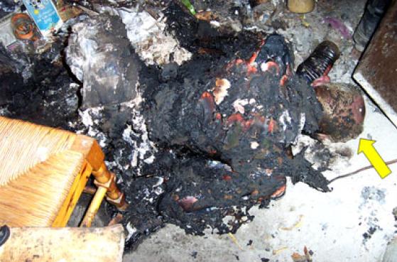 En 2006, el alcalde de una pequeña aldea del centro de Francia no tuvo noticias sobre uno de sus vecinos durante 48 horas. Un hombre divorciado de 57 años de edad que vivía de la asistencia social, era adicto al alcohol y al tabaco, de temperamento violento y carente de habilidades sociales. La puerta de la casa estaba cerrada por dentro, con las llaves todavía en la cerradura (haciendo imposible abrirla desde el exterior con otra llave). El cuerpo fue encontrado cerca de un montón de periódicos, una silla de paja y otros objetos. Algunos estaban quemados, pero otros sólo estaban ennegrecidos con hollín. La silla de paja estaba intacta. El análisis toxicológico del forense confirmó una concentración de alcohol en sangre de 3,20 g/L. El cuerpo no contenía otros materiales inflamables, ni otros xenobióticos. Algunos trozos de la ropa y de una manta que le cubría presentaron etanol (3,2 g/kg), tolueno (0,48 mg/kg), octano (0,25 mg/kg), benceno (0,90 mg/kg) y etilbenceno (cantidad muy baja); estas pequeñas cantidades de hidrocarburos (menores de 1 mg/kg) son insuficientes para justificar una auto-inmolación o un homicidio. La autopsia concluyó que la combustión había ocurrido postmortem, pero era imposible determinar la causa exacta de la muerte. No se encontró hollín en la tráquea o en los pulmones, y tampoco carboxihemoglobina (resultado de una intoxicación por monóxido carbónico) o cianuro en la sangre. La investigación policial no fue concluyente. No hubo indicios de robo con fuerza, ni signos de asalto en la escena del crimen. El experto en incendios no encontró fuentes sospechosas de combustible en la casa que pudieran haber servido para iniciar el fuego.