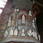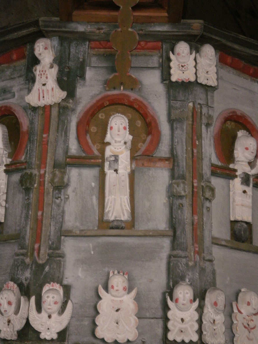 Salimos y nos asomamos a las orillas del río. Le sugerí algunos encuadres para las fotos , con los árboles delante, el agua arrastrando hilos rizados, los insectos bailando encima del agua, los pequeños juncos que se agitaban. Unos cuantos árboles alargados afinaban la percepción de la ribera. Y un poco más cerca había un cementerio. Pero también era un cementerio callado y amistoso, sin grandes panteones, sin casi nombres, con alguna lápida desnuda, con alguna piedra inclinada, con alguna inscripción borrosa. Parecía que presencias sin nombre nos quitaban también a nosotros el nombre. Volvimos a entrar, ella habló con la chica que informaba a la entrada, le transmitió su admiración, la hizo sonreír con su entusiasmo, hizo que se sintieran compañeras en la admiración de Finlandia . Nos acercamos al púlpito y miramos con más detalle las figuras pintadas. Era arte popular e ingenuo lleno de alma, ángeles de color claro que salvaban a las personas, cristos dolorosos que sufrían con nosotros, una voluntad de realzar el sufrimiento del hombre y sacar algo de él, de acrisolar los asombros que tenemos. En el muro frontal había otras figuras, todo lleno de actividad, todo con la inocencia del mito, con el lenguaje de la religión poética cuando no se impone. Y aquel lugar no era para imponer nada, ni para apabullar, solo una casa bien trazada para sentirse más auténtico, para compaginarse con el bosque. Una iglesia en mitad de un bosque que formaba parte del bosque, transustanciada en el alma de Finlandia.