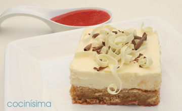 Triturar las fresas, pasarlas por el colador y añadir un poco de azúcar. En un plato colocamos primero el puré de espejo y encima la tarta.