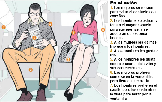 - Son ellos los que suelen empeñarse en ocupar el reposabrazos, ya les corresponda o no (la etiqueta dice que el pasajero que se sienta en el asiento del centro tiene derecho a usar ambos reposabrazos). Muchas mujeres se encuentran también con que ellos estiran sus piernas más allá de lo debido. Son invasivos.