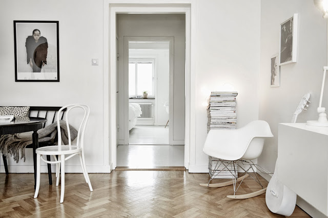 Un espacio lleno de armonía en colores blancos y con piezas de diseño que se cuelgan hasta de la pared. Claves decorativas, y naturalidad de materiales, que le aportan calidez al espacio y crean una atmósfera envolvente en la que me perdería una y mil veces. El suelo en espiga se concibe casi como un tapiz, resaltando las formas de muebles como la RockingChair del matrimonio Eames, o la Tonet en blanco en la zona del comedor.