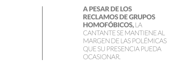 No obstante, a pesar de los reclamos de grupos homofóbicos, la cantante se mantiene al margen de las polémicas que su presencia pueda ocasionar.