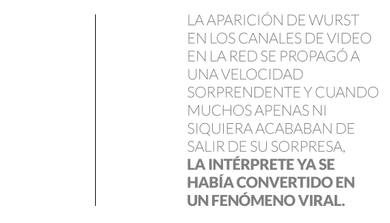 La aparición de Wurst en los canales de video en la red se propagó a una velocidad sorprendente y cuando muchos apenas ni siquiera acababan de salir de su sorpresa, la intérprete ya se había convertido en un fenómeno viral. Habrá que esperar ahora a que llegue mayo para que el mundo juzgue por sí mismo que no sólo se trata de una imagen polémica lo que Conchita vende.