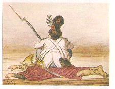 Importaría menos saber de qué conflicto trata esta caricatura de este perfeccionista, escultor, pintor y dibujante francés. Pero otra prueba más de las constantes en el humor es que esa viñeta, cambiando la indumentaria y el armamento, se puede extrapolar actualizándola. Se puede advertir quién ha tomado asiento y sobre qué o quién. Ahora, ¿quién está dando un golpe de estado económico o quién sienta sus reales en Italia, Grecia, España y Europa en general?