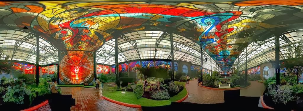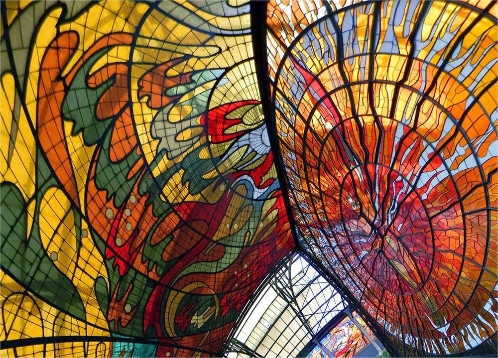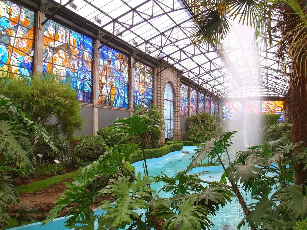 Leopoldo convenció a las autoridades locales para reutilizar el espacio, construido en 1908, como jardín botánico y sustituir las ventanas por artisticas vidrieras.