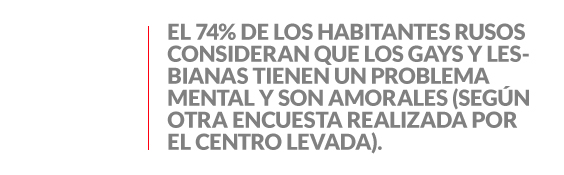 En resumen, la mayoría de la población rusa es ultra conservadora, que cree en las relaciones tradicionales, o sea, las relaciones heterosexuales, por eso no es de extrañarse que el 74% de los habitantes rusos consideren que los gays y lesbianas tienen un problema mental y son amorales (según otra encuesta realizada por el Centro Levada).