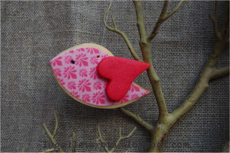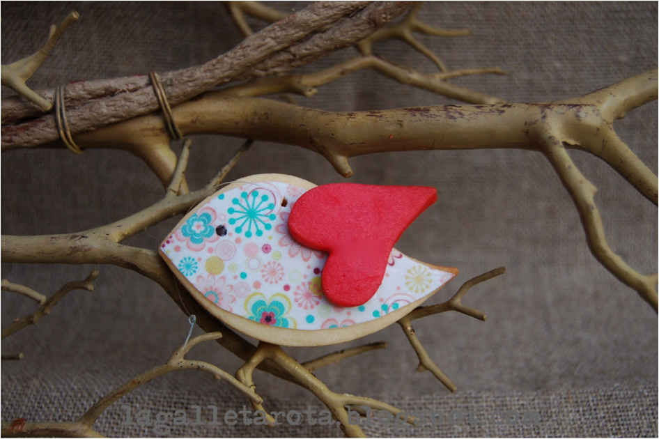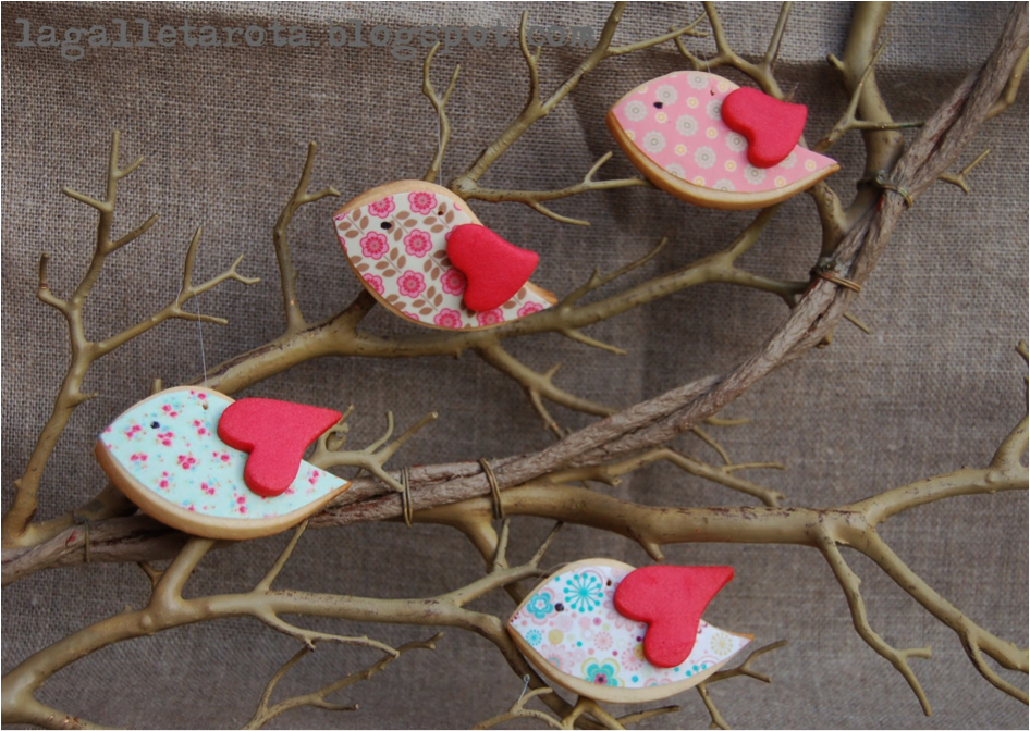 Os pongo aquí la receta que he utilizado para hacer las galletas. Para los corazones he añadido colorante rojo a la misma receta. Y el cuerpo de los pajaritos lo he decorado con papel fondant.