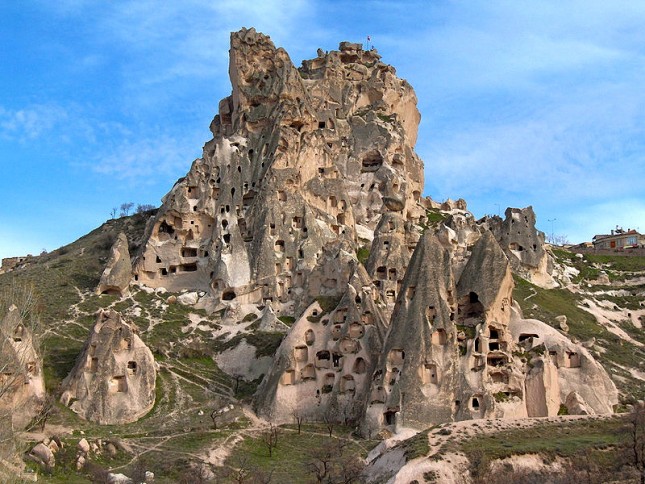 Entre las características crestas pétreas que componen el paisaje de los alrededores de Göreme se disponen caprichosos pináculos en forma de chimenea, que se ha dado en llamar «chimeneas de hada» y presentan coloraciones que van del blanco y el amarillo al rosa, y al gris o casi negro. Entre estas formaciones rocosas comenzaron a asentarse poblaciones cristianas hacia el siglo IV, llegando a crear uno de los complejos habitacionales excavados en la roca más grandes del mundo.