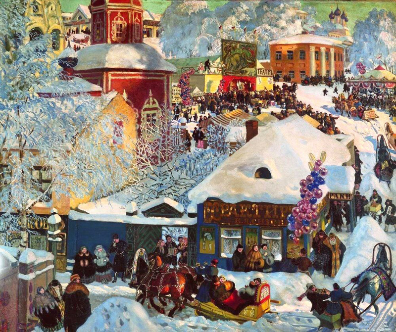 Todo el mundo en Rusia celebraba la Máslenitsa: desde las familias más pobres, que pasaban todo el año ahorrando dinero para celebrar la fiesta de la primavera y la fertilidad, hasta la familia imperial, que organizaba desfiles, bailes y todo tipo de divertimentos de la alta sociedad. A pesar de que la celebración de esta fiesta en la ciudad se distinguía mucho de la del campo, en ambas había un denominador común: una tradicional desmesura en la comida y la bebida. Hace cien años, el periódico Moskóvskie Védomosti publicó un artículo humorístico sobre la celebración de la semana de la Máslenitsa en Moscú. Rusia Hoy ha rescatado esa crónica de hace un siglo que reproducimos en nuestra revista, incorporándole, para ilustrarlo, algunas de las obras que el pintor y escenógrafo ruso Boris Kustodiev (1878 – 1927) dedicó a la citada festividad.