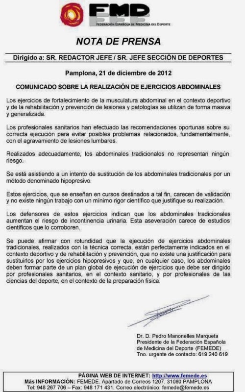 La Federación Española de Medicina del Deporte (FEMEDE) en el año 2012 puso en tela de juicio la validez de los abdominales hipopresivos. Lo hizo mediante la nota de prensa aclaratoria que os dejamos a continuación.