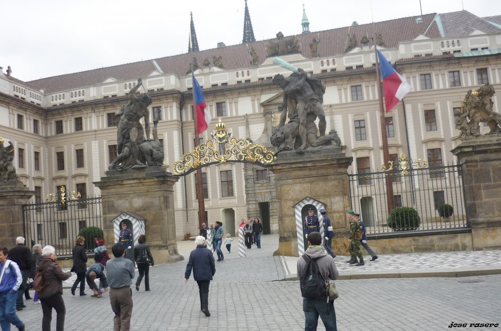 Construido en el siglo IX (y remodelado en 1918 por Joze Plecnik a petición del primer presidente checoslovaco, Tomás Masaryk) no fue hasta siglos después cuando se tiene constancia de Hradcany, el Barrio del Castillo, ciudadela que domina desde lo alto (la colina Strahovský Kláster) los puentes sobre el río Moldava. El Castillo ha sido, tal como apuntábamos, residencia de reyes de Bohemia, de emperadores del Sacro Imperio Romano, de presidentes de Checoslovaquia y, desde 1992, de los presidentes de la República Checa. Considerado como la mayor fortaleza medieval del mundo, su acceso se halla rodeado por una verja monumental del siglo XVIII. Sobre la puerta vemos las estatuas de dos moros gigantescos defendiendo la entrada con puñal y garrote.