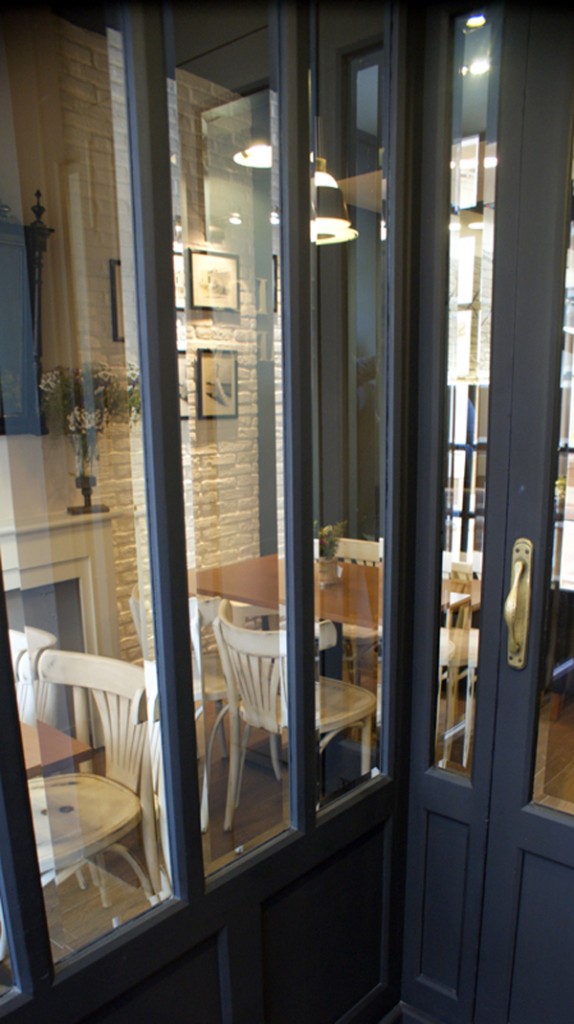Un lugar donde el azul (casi negro) une techo y puertas, donde la barra cobra protagonismo y se hace línea principal del local.