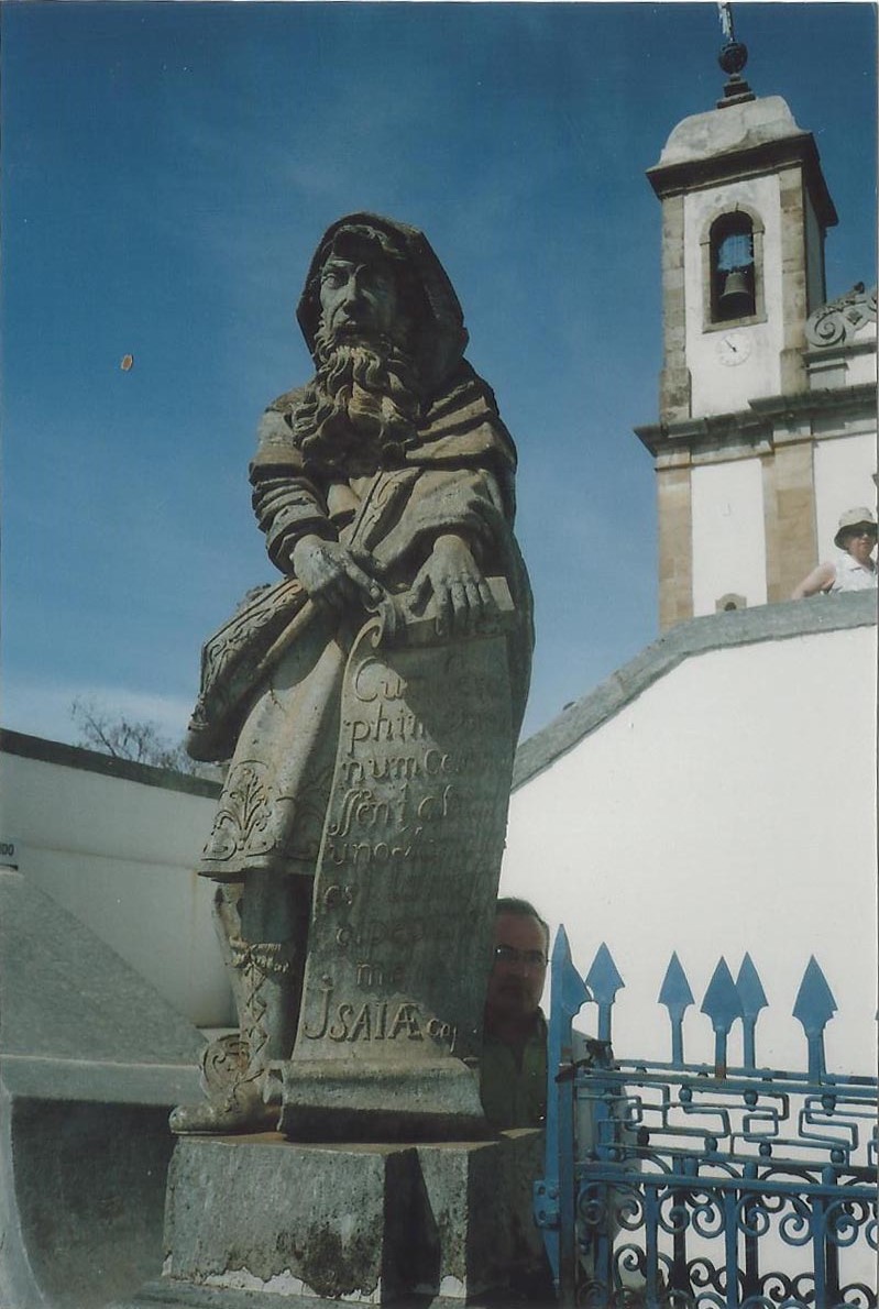 Pero lo más asombroso eran los profetas del Aleijadiño en Congoñas do Campo. El Aleijadiño (el Tullido) , Antonio Francisco Lisboa, fue un genio de la escultura del siglo XVIII que se quedó sin dedos a causa de la lepra. Tenía que sujetar las herramientas a los muñones y a pesar de eso tenía una delicadeza increíble con sus manos, arrancaba las expresiones más sutiles, los más peregrinos grados de la melancolía, los tonemas más escondidos de la saudade. Lo han comparado con Miguel Angel, con los más grandes. Sus obras se pueden apreciar en todo el estado de Minas Gerais. Pero la culminación es el conjunto de Doce Profetas en la escalinata de acceso a la iglesia del Buen Jesús en Congoñas. Están todos, cada uno con su personalidad, con su estado de ánimo, con su visión especial. Isaías parece apesadumbrado y comprensivo. Oseas nos avisa con elegancia. Jonás parece clamar a lo alto desde su ballena. Todos llamándonos a la visión, a salir de nuestro marasmo, a que nos enteremos de que estamos vivos sobre la Tierra. Todos queriendo sacudirnos de verdad, enseñarnos que existe el tiempo, hacer un Apocalipsis con nosotros. Cada uno de ellos con su desgarramiento, con su agonía, con su proximidad exasperada, llamándonos, arrancándonos del despiste como quería Heidegger, arrebatándonos a lo divino en la Tierra.