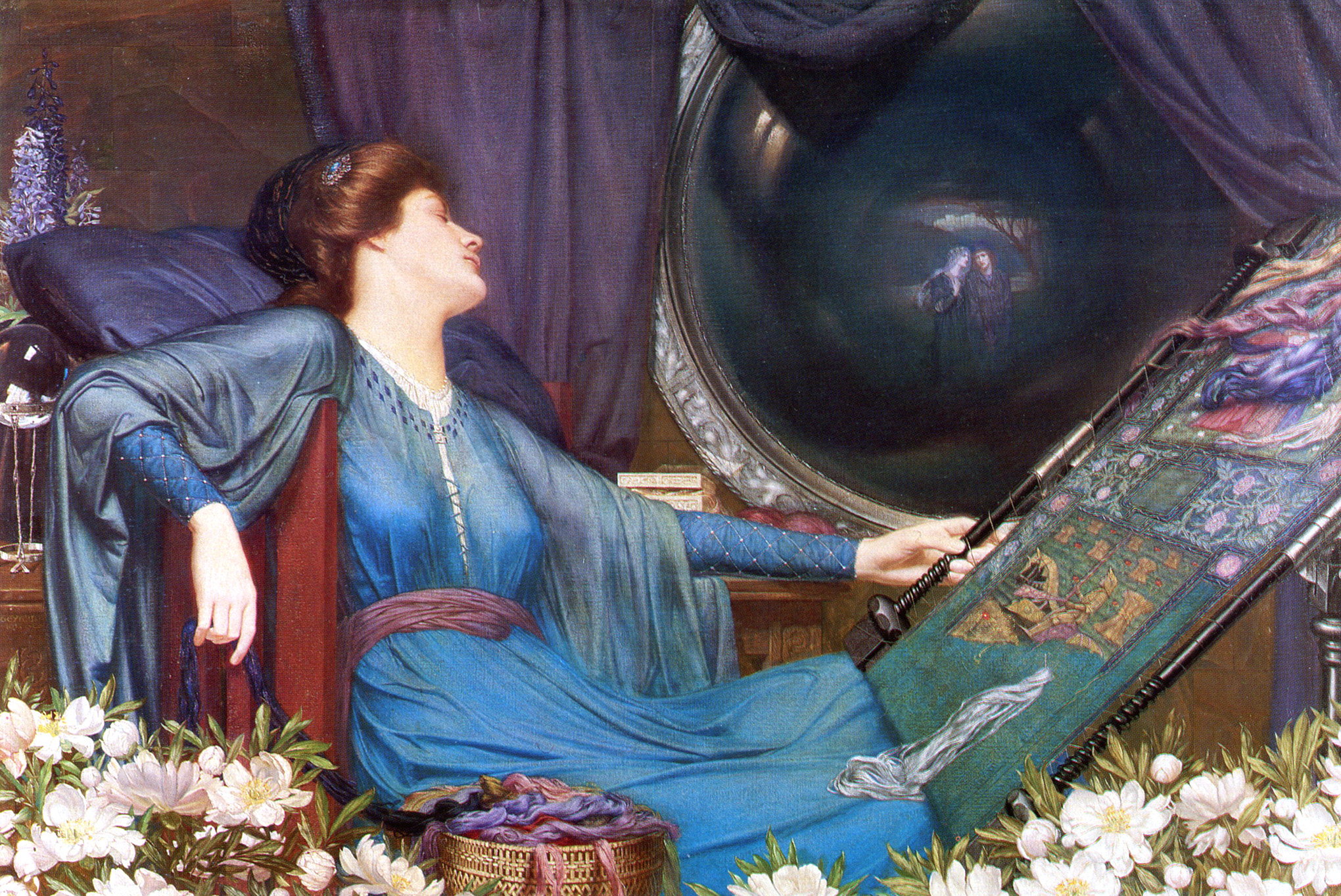 El poema de Tennyson La Dama de Shalott (1833) relata la historia de una mujer forzada por una maldición a permanecer dentro de una torre en Shalott, una isla situada en el río que fluye hacia Camelot. Nadie conoce su existencia, ya que la maldición le prohíbe incluso mirar por la ventana. En su habitación hay un gran espejo que refleja el mundo exterior, y ella pasa las horas tejiendo un tapiz que muestra las maravillas que ve en el espejo.