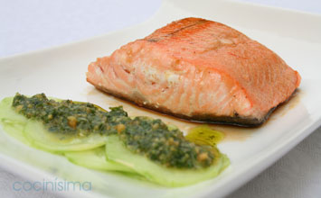 Salmón glaseado con ensalada de pepino y pesto de cacahuetes