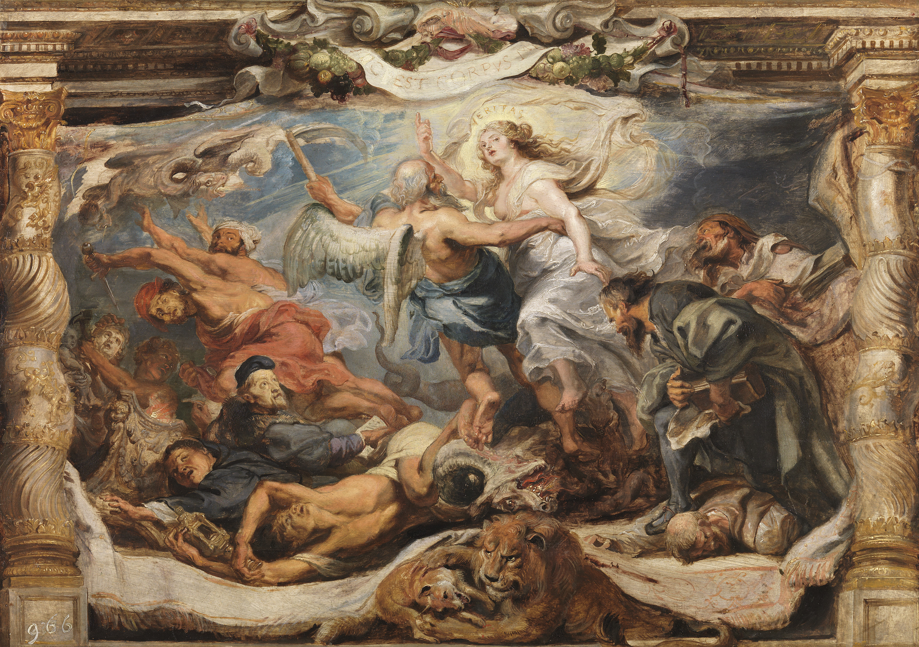 La Victoria de la Verdad sobre la Herejía, Rubens. Óleo sobre tabla, 64,5 x 90,5 cm, h. 1625. Museo Nacional del Prado.