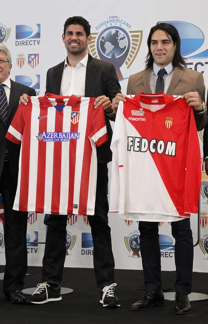 El delantero del Atlético de Madrid, Diego Costa (i) y el delantero colombiano del Mónaco, Radamel Falcao, hoy en el estadio Vicente Calderón.