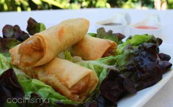 Cortamos toda la verdura a juliana y salteamos junto con la gambas en el wok durante 5 minutos, salpimentamos y escurrimos para que el relleno quede lo máss seco posible y no humedezca en exceso las láminas de pasta. Una vez frío y escurrido extendemos las láminas y colocamos el relleno en el centro. Doblamos la pasta empezando por los laterales hacia el centro luego enrollamos. Sellamos con la yema de huevo y freímos en aceite abundante a 170º-180º hasta que tomen un bonito color dorado.