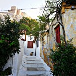 5. En el siglo XIX unos albañiles de las Cicladas levantaron al pie de la Acrópolis el barrio de Anafiotika y allí no van los turistas y por eso se conserva auténtico y uno se pierde por laberintos de escaleras, por callejones que llevan a sorpresas de parras, por tertulias de viejecitos al borde de precipicios mirando el monte Likavitos, por tabernas escondidos entre enredaderas, por pasillos entre calles encaladas de colores. Sus creadores llevaron allí la fantasía y la libertad y la levedad de las islas y parece que ese barrio fuera del tiempo flotara por encima del mar en un sueño. También evoca la Atenas un poco salvaje y aventurera que representan los bandidos de “El rey de las montañas” de Edmond About. Para mí es lo más inolvidable de Atenas y Consuelo y yo siempre hablamos de Anafiotika y queremos regresar a la Anafiotika para olvidarnos de todo y movernos como figuras cretenses.