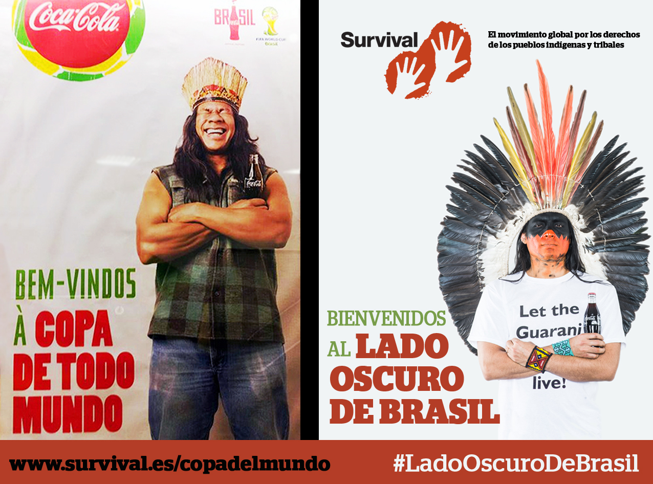 Para llamar la atención sobre la profunda ironía que supone que Coca-Cola y la FIFA promocionen el Mundial con una imagen de un hombre indígena feliz al que acompaña el mensaje “Bienvenidos a la Copa de todo el Mundo”, Survival Internacional ha recreado un anuncio alternativo a modo de parodia que muestra al indígena amazónico Nixiwaka Yawanawá dando la bienvenida al público a “El lado oscuro de Brasil” y reclamando que “¡Dejen vivir a los guaraníes!”.
