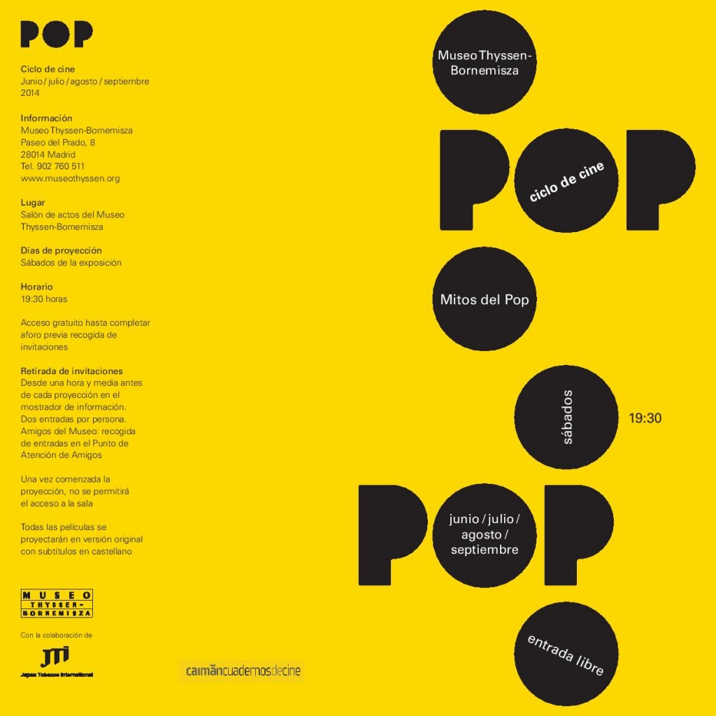 Godard, Warhol y Antonioni. Brigitte Bardot, Marlo Brando y Bruno Lomas. Cortos, largometrajes y documentales. El arte pop se nutrió del cine y el cine se inspiró en la estética pop. Por ello, como complemento necesario a la exposición Mitos del pop, el Museo Thyssen-Bornemisza ha organizado un completo ciclo de cine en el que se proyectarán algunas películas directamente relacionadas con este movimiento artístico, junto a algunos de los títulos cuyos protagonistas deslumbraron a artistas pop como Andy Warhol, quienes los llevaron a sus obras y los convirtieron en iconos de una época.