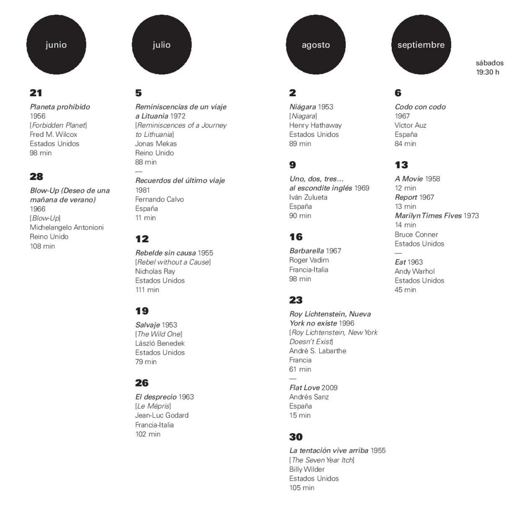 El ciclo se abre, el 21 de junio, con un clásico de la ciencia ficción, Planeta prohibido, de Fred Wilcox (1956), un ejemplo de cultura popular que influyó en algunos creadores plásticos. La genuina estética pop se verá en producciones como Blow-Up, de Antonioni, Barbarella, de Vadim, El desprecio, de Godard, Eat, de Warhol. Y las estrellas de Hollywood convertidas en mitos pop brillarán en Rebelde sin causa (James Dean), Salvaje (Marlon Brando), Niágara (Marilyn Monroe).