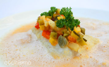 Vertemos el caldo en un plato hondo, disponemos encima el pescado y cubrimos con el salteado de verduras y setas exóticas.