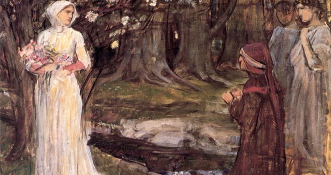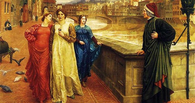 La obra maestra de Dante, La Divina Comedia, escrita alrededor de 1307 y concluida poco antes de su muerte. Se trata de una narración alegórica en verso, de una gran precisión y fuerza dramática, en la que se describe el imaginario viaje del poeta a través del Infierno, el Purgatorio y el Paraíso. Durante su viaje a través del Infierno y el Purgatorio, el guía del poeta es Virgilio, quien para Dante era el representante máximo de la razón. Beatriz, a quien Dante consideró siempre tanto la manifestación como el instrumento de la voluntad divina, le guía a través del Paraíso. La misma Beatriz es la que desciende del Cielo al Purgatorio “en una nube de flores” para buscar al poeta.