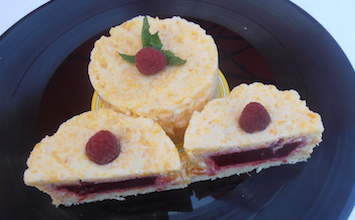 Con ayuda de unos anillos de emplatar sacamos la base y llenamos hasta 2/3 la mousse en el centro colocamos el preparado de frambuesa y cubrimos con la mousse de melocotón.