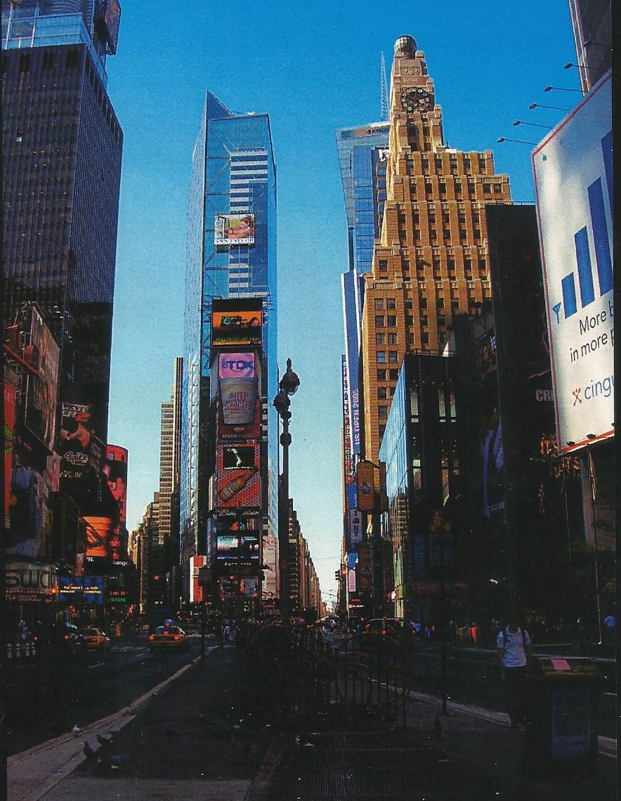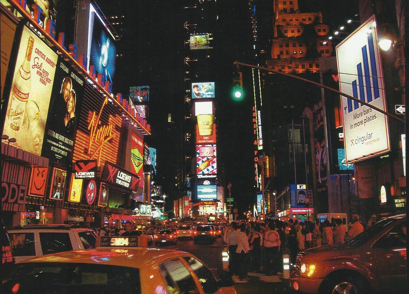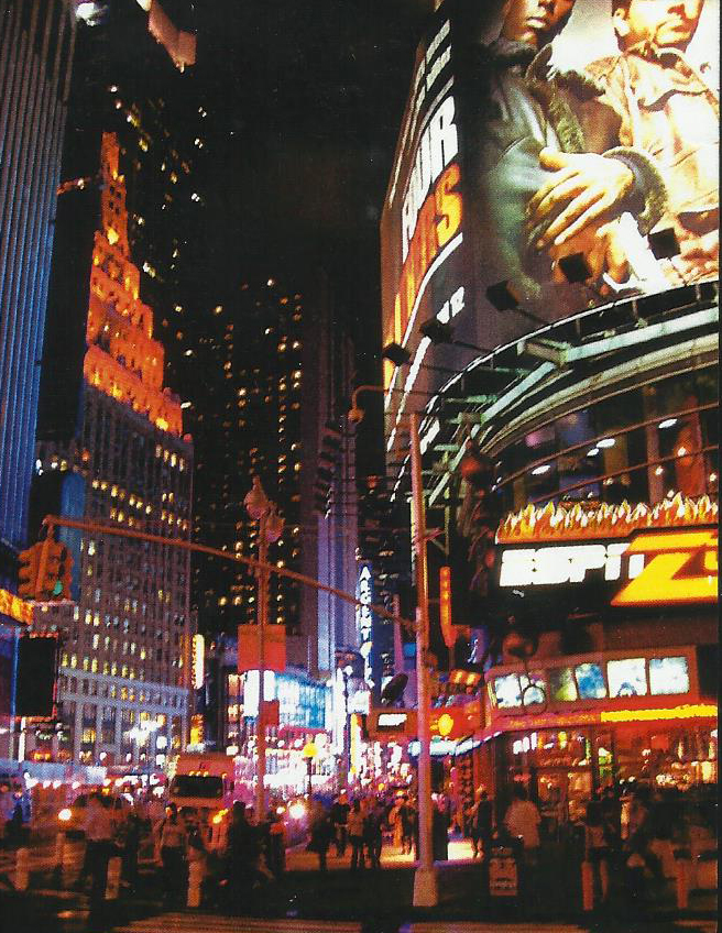 Me pregunto qué hace Kevin Spacey mirándome desde arriba con su boca inteligente, desde niño me fascinaban los prospectos de las películas y mi hermana y yo llegamos a coleccionar quinientas, aquellos prospectos en unas pocas imágenes mezcladas sugerían la atmósfera de toda una historia, la vida parecía tan intensa en ellas, las miradas o los gestos sintetizaban formas de ser o destinos, y eso mismo pasa en Times Square, un rascacielos parece la iluminación de una galaxia, en otro hay una escalera de lirismos incandescentes, figuras humanas se pierden como interrogantes en la noche fantástica y efímera, somos como las visiones de Orión de las que hablaba el replicante de “Blade Runner”, hermosos y malditos como diría Scott Fitzgerald.